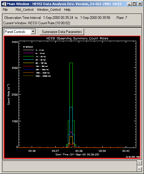This is a snapshot of a plot created by the HESSI Observing Summary Widget. This is a plot of the count rates for Flare 7 in nine energy bands.